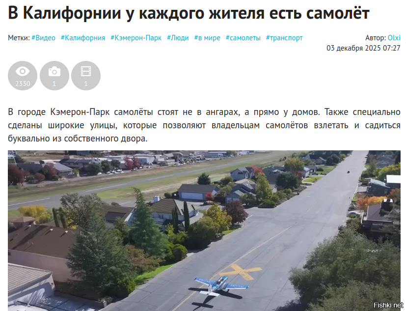 В городе Кэмерон-Парк самолёты стоят не в ангарах, а прямо у домов. Также специально сделаны широкие улицы, которые позволяют владельцам самолётов взлетать и садиться буквально из собственного двора.