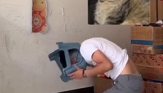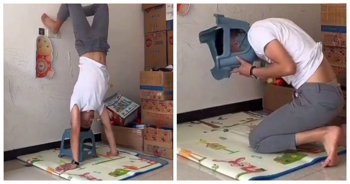 Парень решил попробовать стойку на голове, опираясь на пластмассовый стульчик. Конструкция не выдержала, и голова оказалась зажатой в стуле.