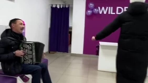 В Казахстане мужчина получил заказанный аккордеон в пункте выдачи и сразу сыграл короткую мелодию. Вместе с ним была жена, которая не удержалась и пустилась в пляс.