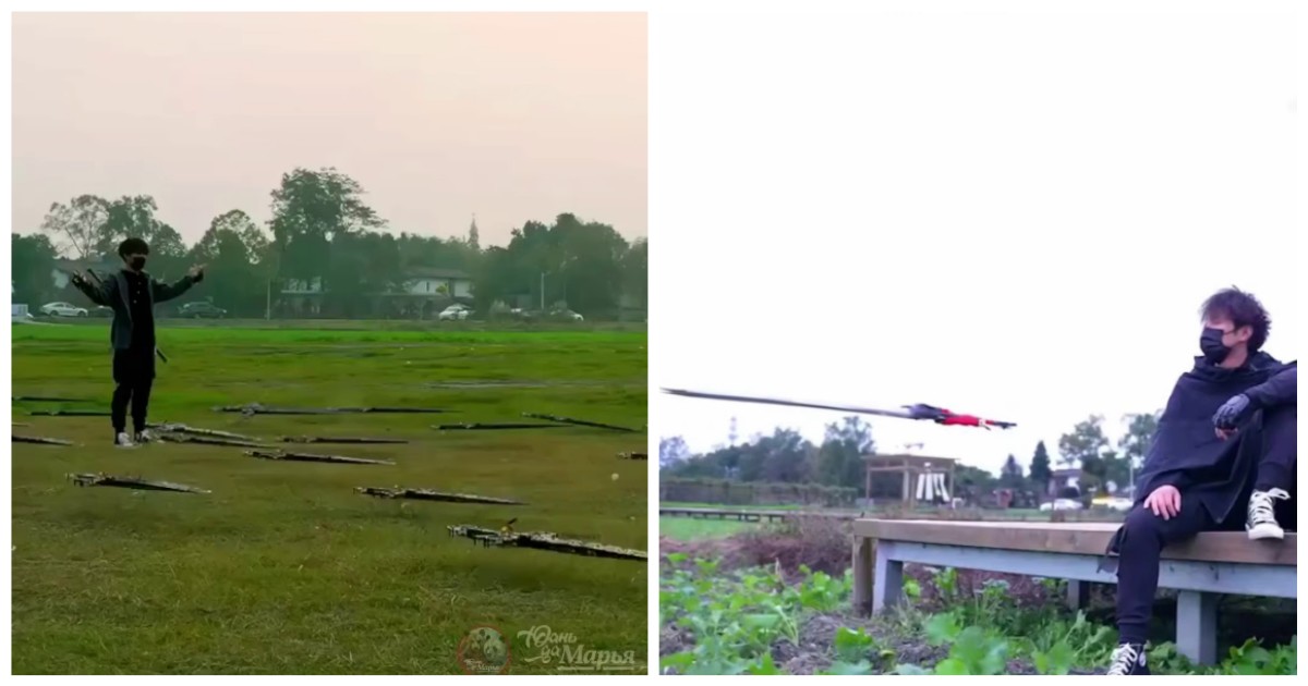Студент-инженер из Китая показал летающие мечи. Они управляются через специальные перчатки, а летают на мини-дронах. Также он продемонстрировал, как пролетает небольшое расстояние на мече-платформе.