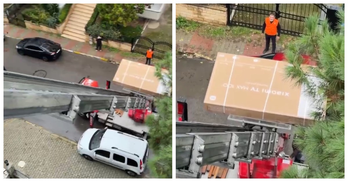 В Турции мужчина купил 100-дюймовый телевизор, но размеры техники оказались слишком велики для лестничных пролётов. В итоге доставщикам пришлось вызвать пожарную автолестницу и поднимать покупку прямо к окну его квартиры.