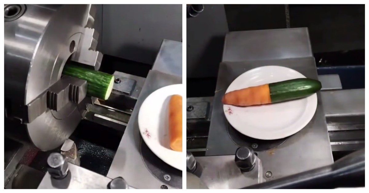 Никогда не знаешь, какая информация может пригодиться в жизни. В видео ниже показано, как при помощи токарного станка с ЧПУ объединить огурец и морковь.