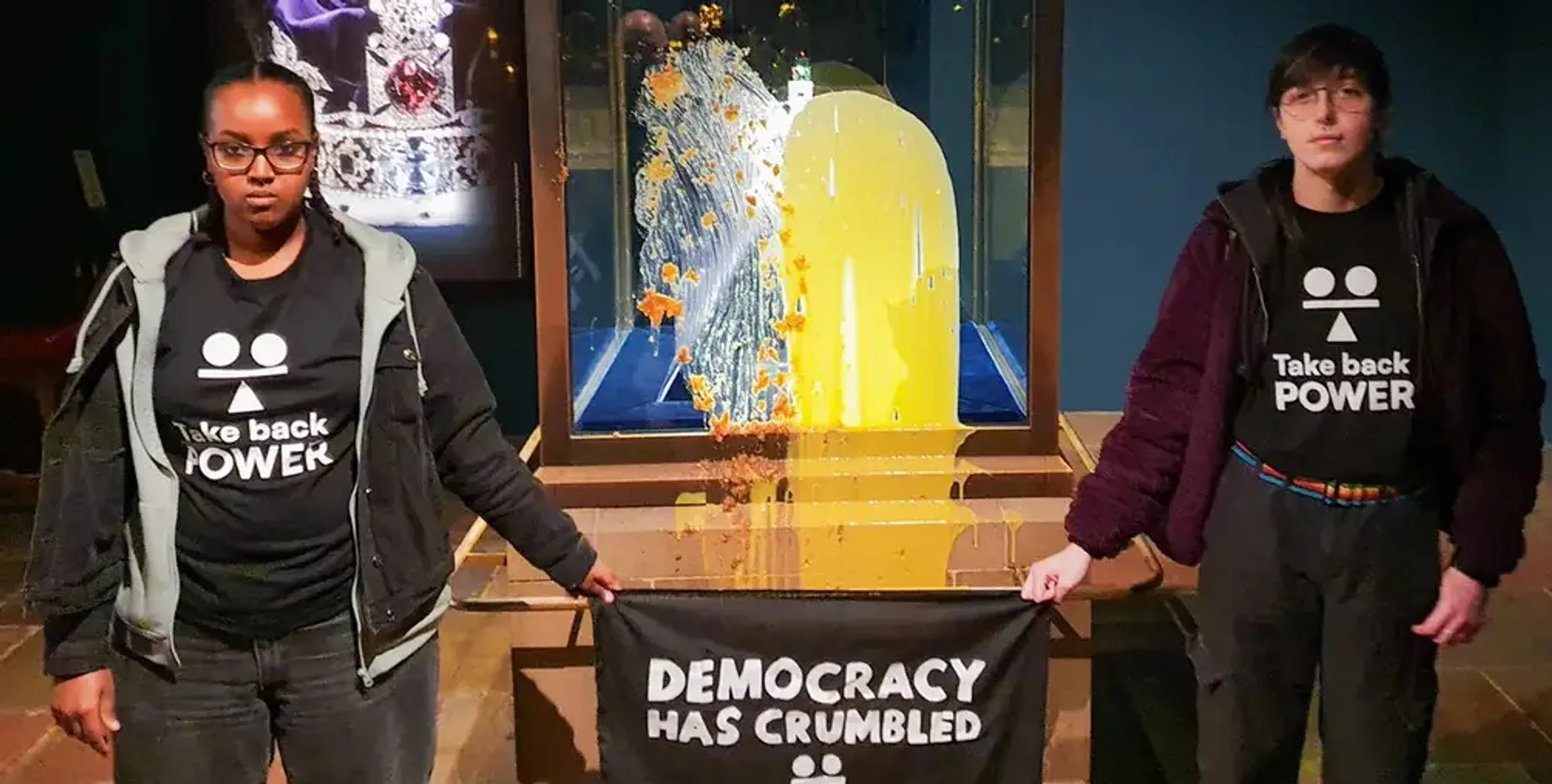 Сначала одна из активисток бросила в стекло пирог, затем витрину облили ярко-желтым кремом, после чего собравшиеся произнесли по громкой связи несколько лозунгов: "Демократия потерпела крах. Британия сломалась. Мы пришли сюда, к драгоценностям нации, чтобы вернуть власть".
