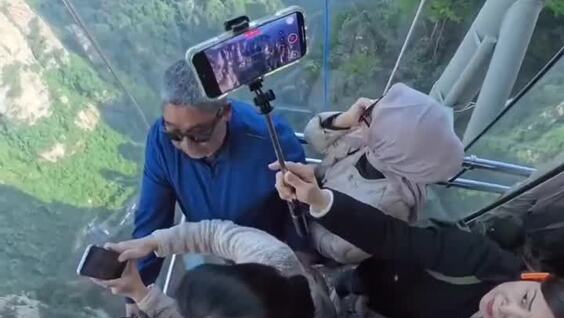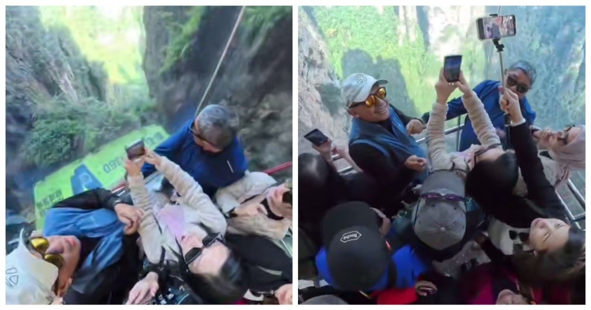 Китайские туристы показали подъем на самом высоком в мире уличном лифте — он едет на вершину 326-метровой скалы.