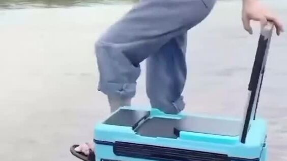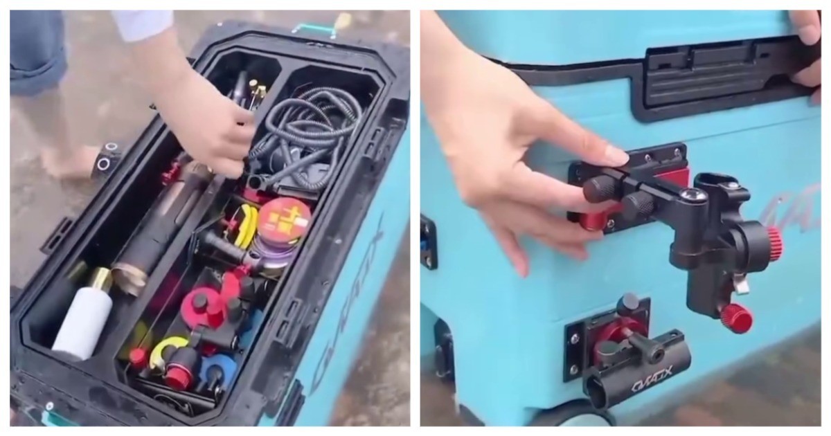 Девушка продемонстрировала рыболовный ящик на колесиках, в котором можно носить снасти и другие необходимые на рыбалке вещи.