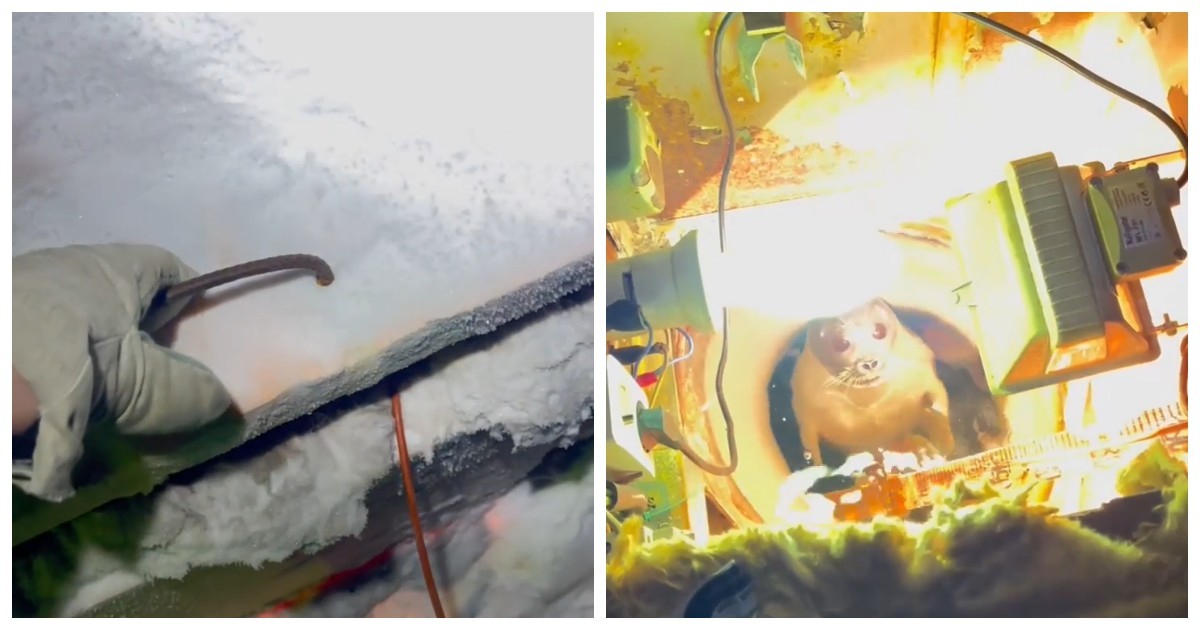 Сотрудник арктической гидрометстанции ежедневно измеряет уровень моря. Но сегодня его рутину внезапно прервала любопытная нерпа, решившая погреться в проруби прямо во время замеров.