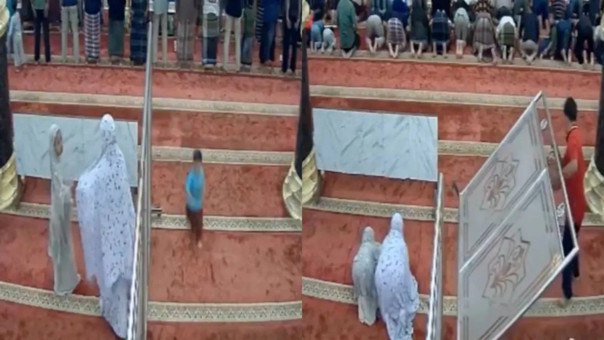 В Индонезии в мечети две девочки играли и случайно опрокинули ограждение, которое упало на проходившего мимо мальчика. После инцидента девочки сделали вид, что непричастны, и начали молиться.