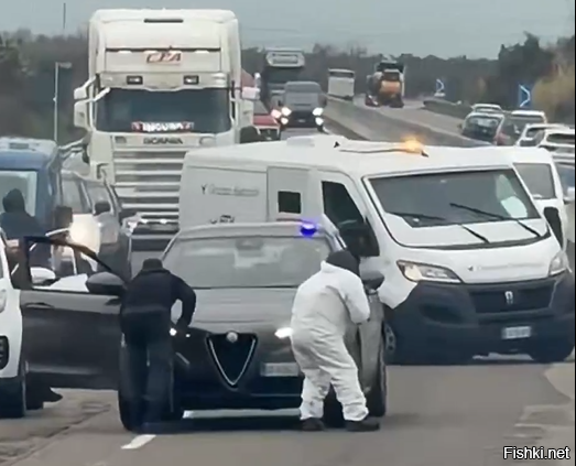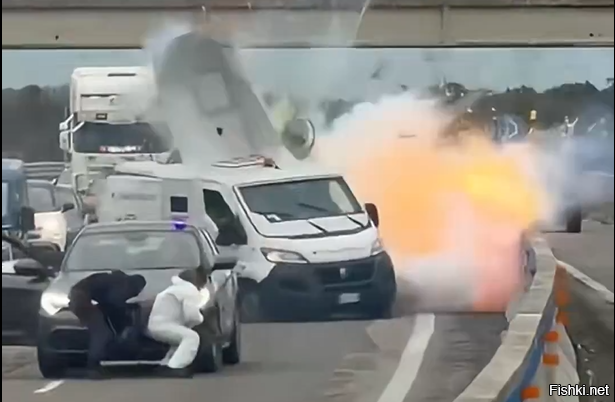 Несколько вооруженных грабителей устроили засаду и перестрелку на трассе в Италии. Они перекрыли дорогу перед инкассаторским фургоном и с помощью взрывчатки попытались добраться до денег.