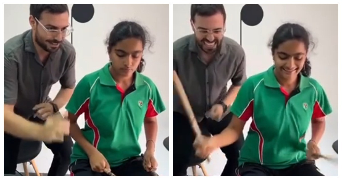Учитель игры на барабанах, который по-настоящему любит свою работу. Он не только подсказывает ученице, но и заряжает энергией, и искренне радуется успехам.