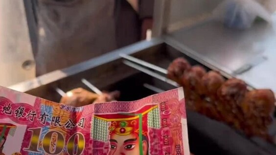История из города Цзаочжуан провинции Шаньдун. На ролике видно, как пожилая женщина расплачивается в лавке с шашлычками ритуальными деньгами, предназначенными для подношений умершим. Несмотря на то, что купюры не имеют реальной ценности, продавец без возражений принимает их и дает ей еду.