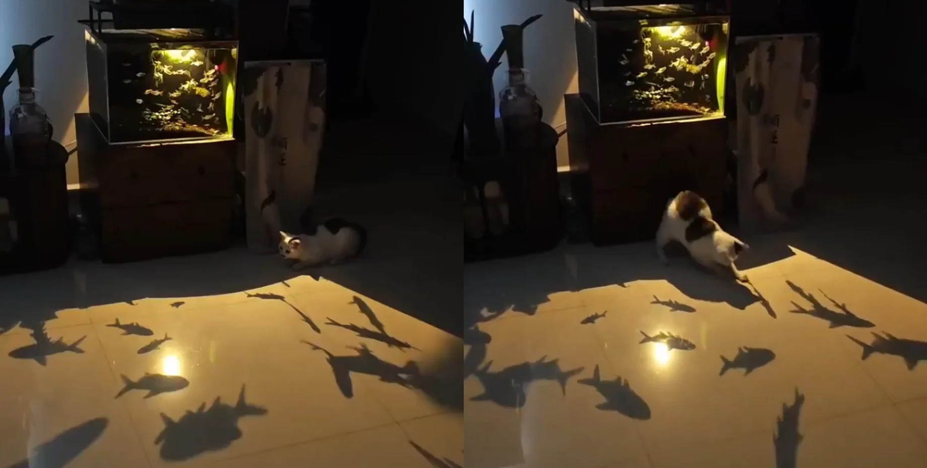 Кот пытается поймать рыбок в аквариуме с помощью обычной лампочки. Четвероногий активно «охотится», но каждый раз остаётся без улова, вызывая улыбку у всех, кто наблюдает за его попытками.